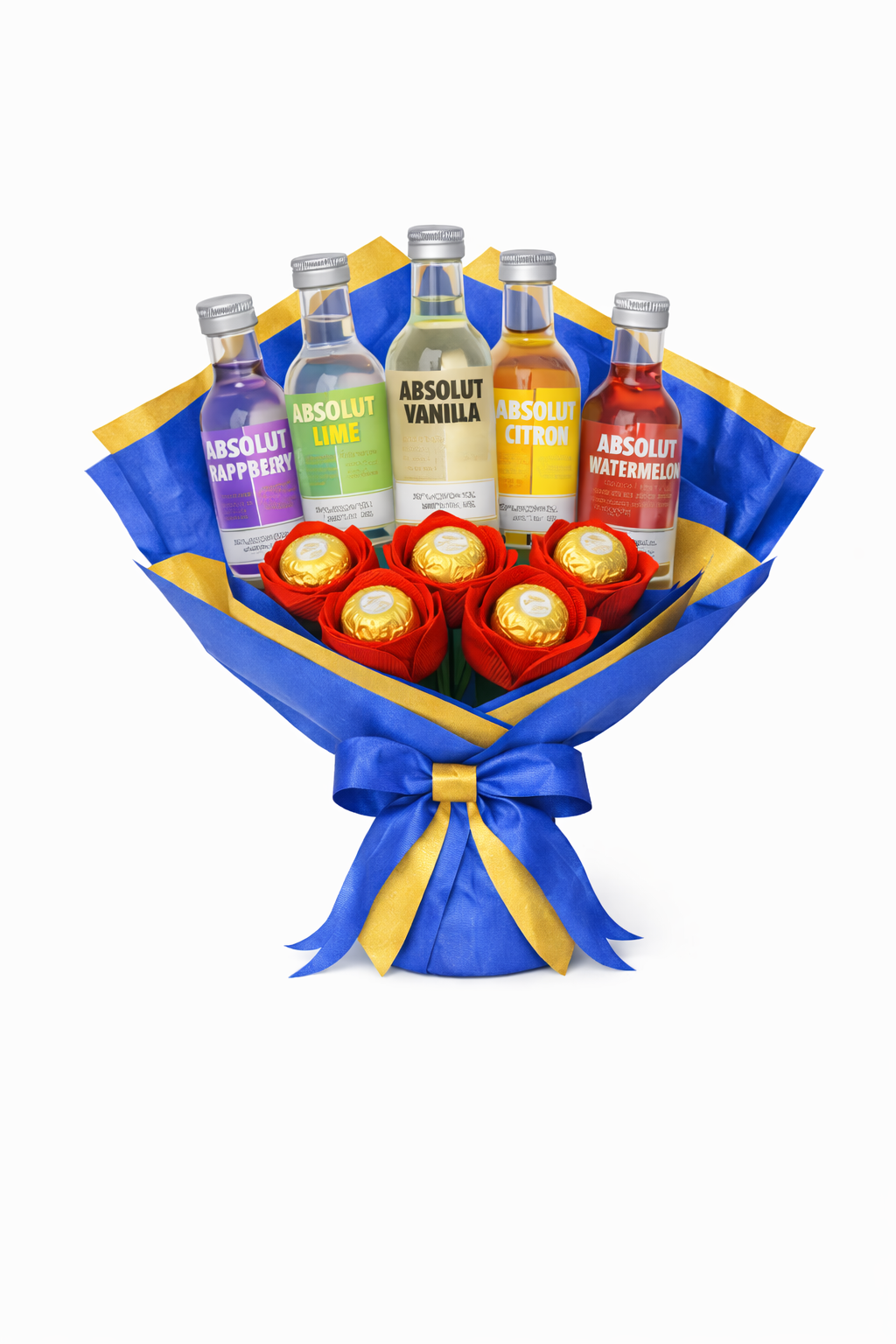 Original ramo premium compuesto por 5 mini botellas de vodka Absolut de diferentes sabores (Raspberry, Lime, Vanilla, Citron y Watermelon) acompañado de 5 bombones Ferrero Rocher presentados como rosas y protegidos con cápsula transparente para una conservación perfecta. Además podrás mandar un mensaje dedicatoria en video, texto y/o audio. Un detalle elegante, moderno y diferente para sorprender.