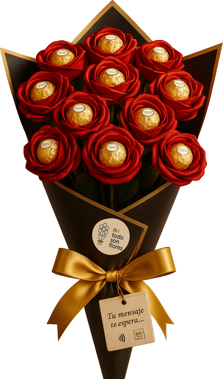 Este ramo imita rosas y esconde bombones Ferrero Rocher, cada uno protegido individualmente con una cápsula de plástico transparente, para que lleguen perfectos, limpios y listos para el gran momento.