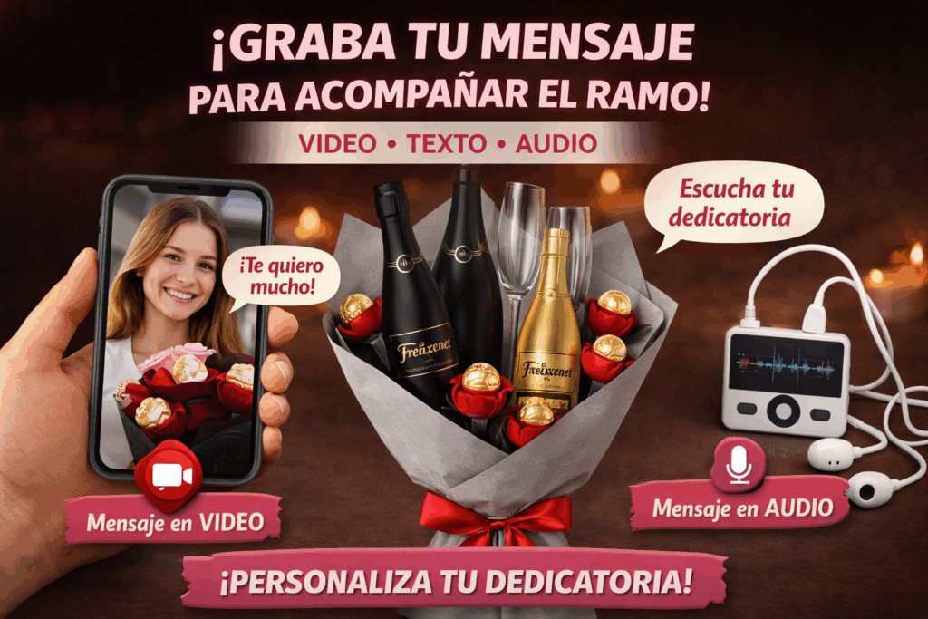 Además, cada ramo puede ir acompañado de una dedicatoria en vídeo, audio o texto, que el comprador graba directamente desde su móvil, sin registros y con total privacidad. El mensaje se envía mediante un código único y personal, accesible solo para el destinatario.